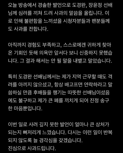 - “도경완·장윤정 선배님께 사과드리며, 시청자 여러분께도 진심으로 사과드립니다.”