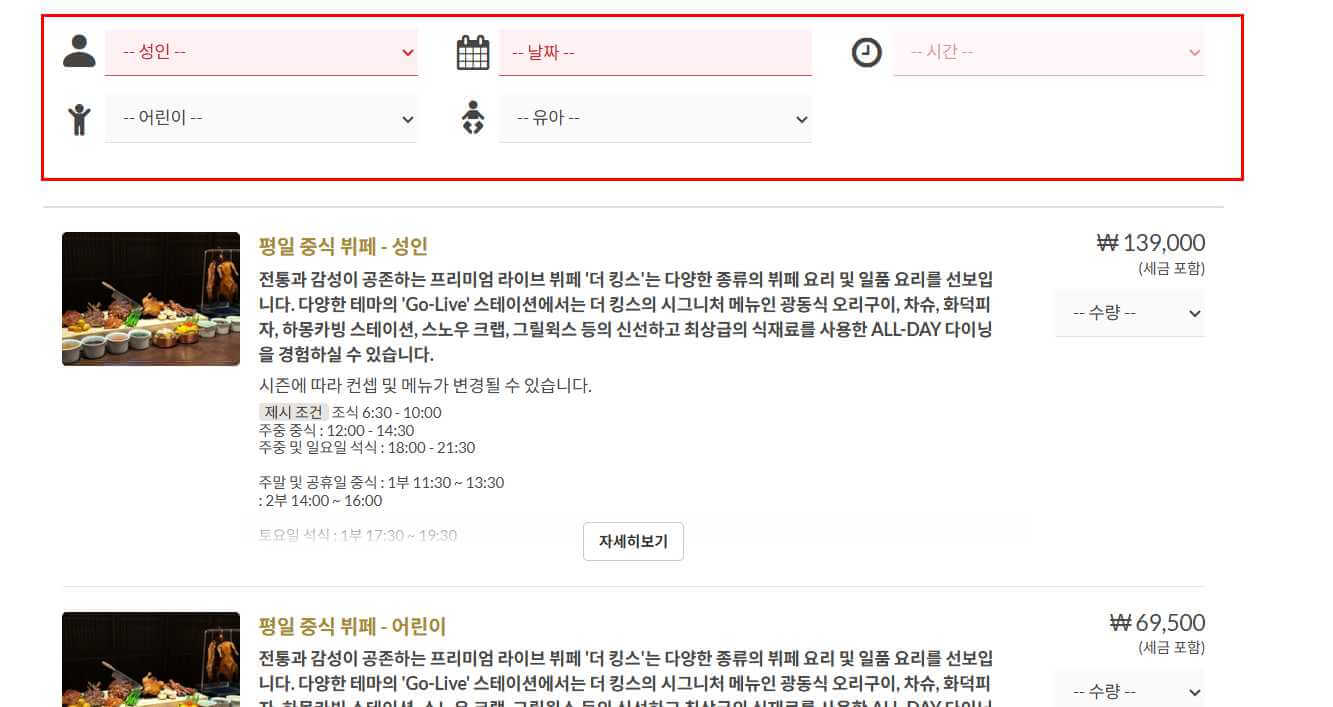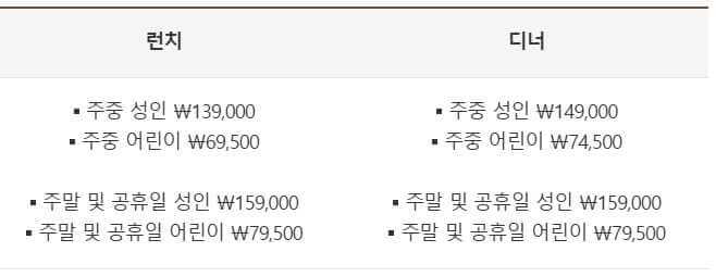 조식은 예약이 안됩니다. 조식이 아니더라고 더 킹스를 이용하고 싶으시다면, 중식 뷔페와 저녁뷔페는 예약이 가능하니 미리미리 확인하시는 것을 추천드립니다. 중식, 저녁 가격은 아래와 같습니다.