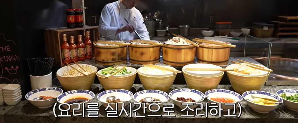 더 킹스 조식 뷔페는 전문 셰프가 현장에서 직접 조리하며, 모든 섹션이 오픈 키친으로 구성되어 있습니다. 선우용녀 님은 야채, 한식 위주로 식사를 하시더라고요.